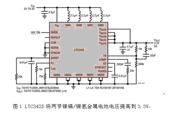 例如,考慮單片、同步、高開關頻率(每相高達2MHz)、四相電源集成電路架構。這類產(chǎn)品的一個例子是LTC3425,如圖1所示。它允許使用多個體積小、成本低的電感器,而不是單個又大、又笨重的電感器,而且與同類單相電路相比,需要少得多的輸出濾波器電容,因為有效的輸出紋波頻率高達8MHz。此外,所需的全部功率MOSFET都在芯片內(nèi)。這非常適用于需要使用扁平組件以及空間受限的電路板和便攜式設備。