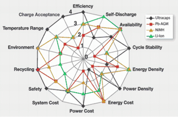 Li離子、NiMH等新型電池可以提供一個可靠的能量儲存方案,并且已經(jīng)在很多領(lǐng)域中廣泛使用。眾所周知,化學(xué)電池是通過電化學(xué)反應(yīng),產(chǎn)生法拉第電荷轉(zhuǎn)移來儲存電荷的,使用壽命較短,并且受溫度影響較大,這也同樣是采用鉛酸電池(蓄電池)的設(shè)計者所面臨的困難。同時,大電流會直接影響這些電池的壽命,因此,對于要求長壽命、高可靠性的某些應(yīng)用,這些基于化學(xué)反應(yīng)的電池就顯出種種不足。