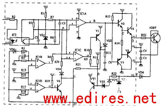 在M57962L輸入端13和14無電流時,IC1截止,A點電位上升使IC2A的2腳變?yōu)榈碗娢唬瑒t使V3、V5導通,V2、V4截止。lGBT的門極(GATE)通過V5導通到VEE,而使IGBT關(guān)斷。IC2C的14腳輸出為低電平, 使V1、V7導通, 使IC2B、IC2D保持原先狀態(tài)不變。