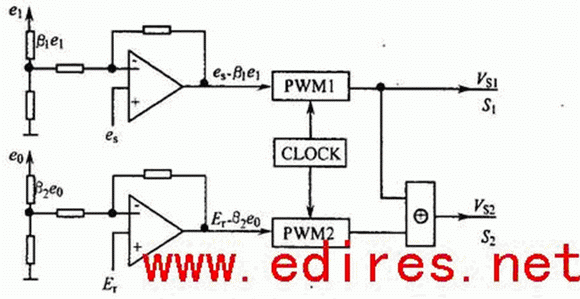 es = i1Rs 壓降,與β1e1 經(jīng)加減運(yùn)算電路后得es-β1e1 并送入PWM 1控制器。 其輸出Vs1作為開(kāi)關(guān)管S1 的驅(qū)動(dòng)信號(hào),S1的導(dǎo)通時(shí)間為Ton1。它采用的是前饋控制,目的是把e1 和i1的擾動(dòng)所引起的系統(tǒng)瞬態(tài)誤差減到最小,以改善系統(tǒng)的瞬態(tài)響應(yīng)。