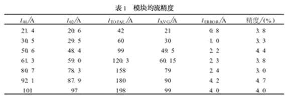 用兩個電源模塊作并聯(lián)實(shí)驗(yàn), 實(shí)驗(yàn)數(shù)據(jù)見表1所列。由表1知, 它的負(fù)載均流精度(負(fù)載不平衡度)控制在5%以內(nèi)。