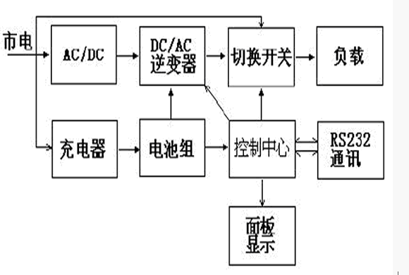 圖1 為在線式UPS 的主電路,在線式UPS 電源具有獨立的旁路開關(guān)、AC/DC 整流器、充電器、DC/AC 逆變器等系統(tǒng),工作原理是:市電正常時AC/DC 整流器將交流電整流成直流電,同時對蓄電池進(jìn)行充電,再經(jīng)DC/AC 逆變器將直流電逆變?yōu)闃?biāo)準(zhǔn)正弦波交流電,市電異常時,電池對逆變器供電,在UPS 發(fā)生故障時將輸出轉(zhuǎn)為旁路供電。在線式UPS輸出的電壓和頻率最為穩(wěn)定,能為用戶提供真正高質(zhì)量的正弦波電源。