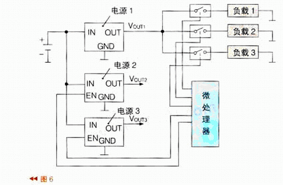 在實(shí)際應(yīng)用中,往往由于電路復(fù)雜而采用電源管理IC及多個(gè)負(fù)載開(kāi)關(guān)組成的負(fù)載管理系統(tǒng),如圖6所示。圖6中有3個(gè)電源,輸出不同的電壓。電源1給負(fù)載1~3供電。為了控制負(fù)載1~3的通電或失電,在電源與負(fù)載之間設(shè)了3個(gè)負(fù)載開(kāi)關(guān)。電源2、電源3則由電源管理IC來(lái)控制其負(fù)載的通電或失電。