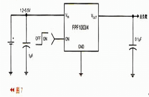 該器件典型應(yīng)用電路如圖7所示,輸入電容一般為1μF,輸出電容為0.1μF(都采用多層陶瓷電容器)。如在ON端加邏輯高電平時(shí),開(kāi)關(guān)導(dǎo)通(VIN=1.2V時(shí),VIH≥0.8V;VIN=2.7~5.5V時(shí),VIH≥2V);ON端加邏輯低電平時(shí),開(kāi)關(guān)關(guān)斷(VIN=1.2V時(shí),VIL≤0.35V;VIN=2.7V~5.5V時(shí),VIL≤0.8V)。RDS(on)與VIN有關(guān):VIN=5.5V時(shí),RDS(on)≤30MΩ;VIN=1.2V時(shí),RDS(on)≤150MΩ。