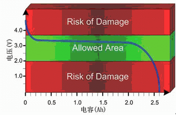 一旦電壓超出允許范圍,鋰電池很容易被損壞(見圖1)。如果超出電壓的上限和下限(例如,nanophosphate鋰電池的電壓上限和下限分別為3.6V和2V),電池就可能會受到不可逆的損壞,至少也會增加電池的自放電率。在相當(dāng)寬的荷電狀態(tài)范圍內(nèi),輸出電壓可以保持穩(wěn)定,因此正常情況下超出安全范圍的可能性比較小。但是,在接近安全范圍上限和下限的區(qū)域,變化曲線非常陡峭。作為預(yù)防措施,仔細(xì)監(jiān)測電壓水平非常必要。