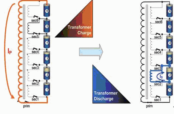 閉合主繞組開關(guān),電池組向變壓器充電。然后斷開主繞組開關(guān),閉合相應(yīng)的次繞組開關(guān)(本例中為2號次繞組開關(guān)),變壓器儲存的能量轉(zhuǎn)移到指定的電池上。