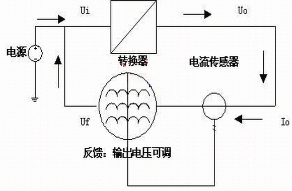 在能量反饋部分就要能實(shí)現(xiàn)上述要求,保證穩(wěn)定的電能轉(zhuǎn)換器的輸出電流,采用電流傳感器檢測(cè)電能轉(zhuǎn)換器的輸出電流,同時(shí)反饋部分采用反饋電壓與輸出控制電流之間成反比系數(shù)關(guān)系即Uf∝K/Io,為便于分析,設(shè)電源電壓Ui為穩(wěn)定值。當(dāng)輸出電流較小時(shí),通過(guò)調(diào)節(jié)反饋電壓,使其變大,則反饋電壓與輸入的電壓差△U=Uf-Ui變大, 相應(yīng)的由反饋電壓流向輸入電壓的電流加大,造成相應(yīng)的反饋功率加大;當(dāng)輸出電流較大時(shí),通過(guò)調(diào)節(jié)反饋電壓,使Uf變小,則反饋電壓與輸入的電壓差△U變小,相應(yīng)的由反饋電壓流向輸入電壓的電流減小,造成循環(huán)的功率減??;整個(gè)過(guò)程維持負(fù)反饋控制,最終達(dá)到動(dòng)態(tài)平衡,維持設(shè)定的額定功率。