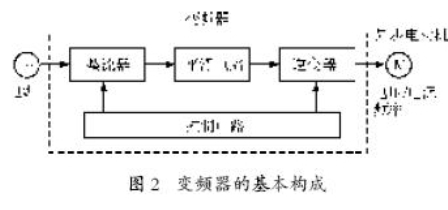 圖2所示為變頻器的基本構(gòu)成。它的基本原理是用一種特定的方式對變頻器中的晶閘管開關(guān)進行導(dǎo)通和關(guān)斷,直接把輸入的電壓波形“大致”調(diào)制成所需頻率的交流波形。