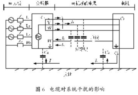 頻率范圍為150 kHz~30 MHz的電子干擾一般來自傳導(dǎo)。傳動系統(tǒng)中范圍為30 MHz~1 GHz 的空間輻射干擾產(chǎn)生于逆變器,電機電纜及電動機。由于電動機電壓較高的dv/dt 以及電機電纜上的容性電流產(chǎn)生了漏電流,而且使用屏蔽的電機電纜也會增加漏電流,如圖6所示。