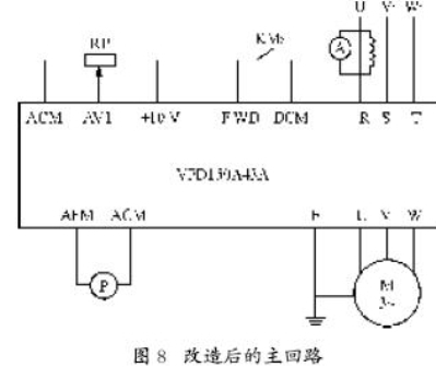由于這是對舊設(shè)備進行改造,所以在改造中充分考慮并照顧操作人員的操作習(xí)慣,保持原有的工作順序不變。根據(jù)操作人員的實際需要,重新設(shè)計了主回路及控制回路。用電位器給定頻率,控制電動機的轉(zhuǎn)速,實現(xiàn)無級調(diào)速。用一轉(zhuǎn)速表顯示電動機的實際轉(zhuǎn)速,給操作人員提供可靠的操作依據(jù)。