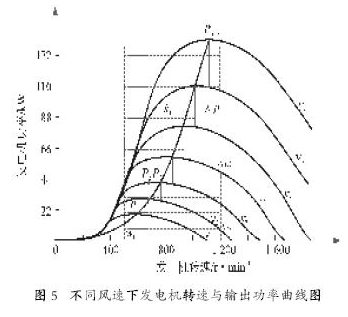 風力機通過葉輪來捕獲流動的風能,風的能量轉(zhuǎn)化為葉輪旋轉(zhuǎn)的動能,齒輪箱再把這種機械能傳輸?shù)桨l(fā)電機,由發(fā)電機通過內(nèi)部的電磁關(guān)系將機械能變?yōu)殡娔茌敵?。圖5為在不同風速下,葉輪轉(zhuǎn)速與風力機輸出功率的關(guān)系圖。由圖可知,對應(yīng)于每個風速的曲線,都有一個最大輸出功率點,風速越高,輸出功率越高,相應(yīng)的葉輪轉(zhuǎn)速也越高。因此,如果能隨風速變化改變?nèi)~輪轉(zhuǎn)速,使得風力機在所有風速下都工作于最大功率輸出點,則發(fā)出電能最多,否則發(fā)電效能將降低。