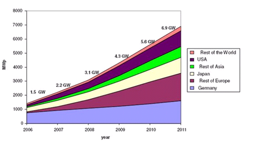 根據(jù)歐洲光伏工業(yè)協(xié)會(huì)(EPIA)的數(shù)據(jù)顯示,2010年太陽(yáng)能發(fā)電量的增幅可達(dá)4倍,達(dá) 5550 兆瓦。如圖1所示,為歐洲光伏工業(yè)協(xié)會(huì)對(duì)全球太陽(yáng)能光伏發(fā)電量的預(yù)測(cè)。