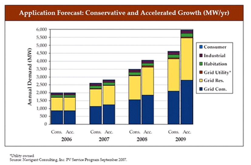 中國(guó)政府在《可再生能源長(zhǎng)期規(guī)劃》提出,太陽(yáng)能光伏發(fā)電裝機(jī)容量到2010年將發(fā)展到450MWp,而2005年全國(guó)太陽(yáng)能發(fā)電裝機(jī)容量?jī)H為6.5MWp,這就意味著中國(guó)太陽(yáng)能裝機(jī)容量的復(fù)合增長(zhǎng)率將會(huì)高達(dá)38%以上。了解目前太陽(yáng)能光伏市場(chǎng)發(fā)展動(dòng)態(tài),把握太陽(yáng)能光伏行業(yè)發(fā)展趨勢(shì),對(duì)于半導(dǎo)體行業(yè)的發(fā)展是至關(guān)重要的。