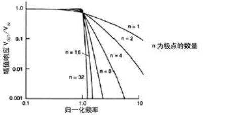 圖1 幾個(gè)低通濾波器的幅值響應(yīng)與歸一化頻率的關(guān)系曲線。如果濾波器傳遞函數(shù)有多個(gè)極點(diǎn)(或階數(shù)),則頻率越高,衰減越快。