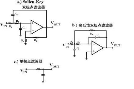 圖4 Sallen-Key (a)和多反饋 (b)濾波器都是2階,都有2個(gè)極點(diǎn)。單極點(diǎn)濾波器(c)是1階濾波器。這些模塊可以級聯(lián),以生成高階濾波器。