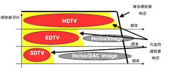 ED 480p/576p信號(hào)也可能出現(xiàn)這種情況。此類信號(hào)通常采樣頻率為54MHz,視頻帶寬為 12MHz。因此,第二Nyquist區(qū)圖像會(huì)在42MHz時(shí)出現(xiàn)。如果無(wú)源濾波器為35MHz或更高,那么圖像的衰減也會(huì)很小,同樣也會(huì)導(dǎo)致畫質(zhì)非常差。