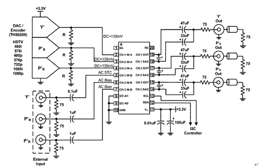 AC偏置非常簡(jiǎn)單。THS73x3有兩個(gè)電阻,其可在電源和接地間創(chuàng)建分壓器。該模式的輸入阻抗為20kΩ,因此所用的電容應(yīng)足夠大,以盡可能減小傾斜或下垂問(wèn)題。該模式最適用于Chroma或色差信號(hào),也可用于Luma信號(hào)、G’B’R’信號(hào)或計(jì)算機(jī)的R’G’B’信號(hào)。由于信號(hào)為AC耦合,且DC偏置點(diǎn)與平均信號(hào)電平有差異,因此對(duì)于帶5V電源同步信息的信號(hào)而言,我們最好用AC偏置模式,以確保沒(méi)有剪切問(wèn)題發(fā)生。