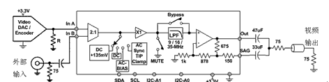 如果系統(tǒng)設(shè)計(jì)中已經(jīng)采用了THS7303或THS7313 6dB增益放大器,并采用了參考接地的DAC或編碼器驅(qū)動(dòng),那么DC輸入模式會(huì)很理想。問(wèn)題在于,DAC生成的電壓有多低?如果同步信號(hào)(通常這是視頻信號(hào)中電壓最低的)電壓低于50mV,那么6dB放大器的輸出就應(yīng)生成低于100mV的電壓,由于CMOS和雙極放大器都存在晶體管飽和方面的限制,因此這對(duì)任何放大器來(lái)說(shuō)都是很難做到的。