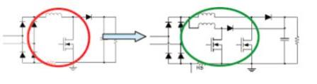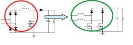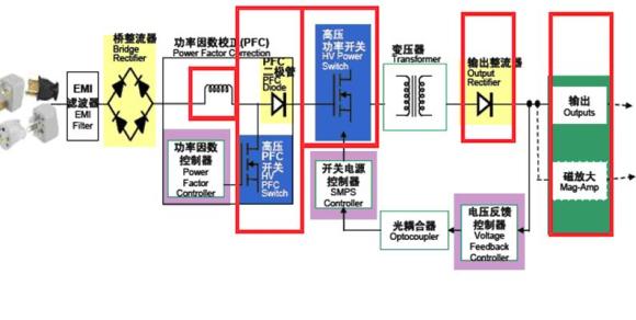 能效規(guī)范對電路段的挑戰(zhàn)主要體現(xiàn)在PFC能效、主轉(zhuǎn)換器能效和次級能效幾個方面。要提高這幾個方面的能效,就必須改善如圖1所示電路紅色框中的元件性能。以下將介紹改善電路段能效的幾種方法。