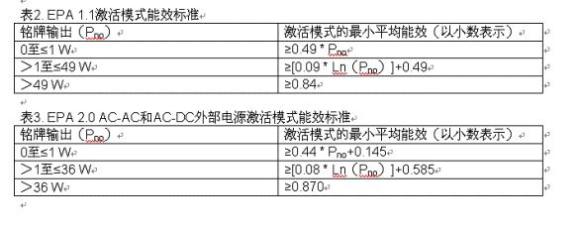 美國環(huán)保署外部電源1.1版和2.0版規(guī)范分別對激活模式能效標準,以及AC-AC和AC-DC外部電源激活模式能效標準做出了規(guī)定,如表2和表3所示。