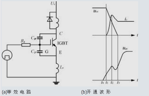 在t0時刻,柵極驅(qū)動電壓開始上升,此時影響柵極電壓uge上升斜率的主要因素只有Rg和Cge,柵極電壓上升較快。在t1時刻達到IGBT的柵極門檻值,集電極電流開始上升。從此時開始有2個原因?qū)е聈ge波形偏離原有的軌跡。