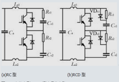 為了使IGBT關(guān)斷過電壓能得到有效的抑制并減小關(guān)斷損耗,通常都需要給IGBT主電路設(shè)置關(guān)斷緩沖吸收電路。IGBT的關(guān)斷緩沖吸收電路分為充放電型和放電阻止型。充放電型有RC吸收和RCD吸收2種。如圖6所示。