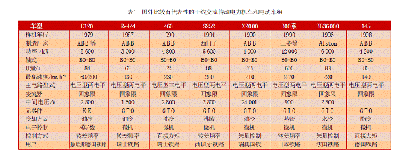 [page]20世紀(jì)70年代以來,電力電子學(xué)和微電子技術(shù)的出現(xiàn)和進(jìn)步,又重新喚起人們對交流傳動系統(tǒng)的熱情。自1971年世界首臺采用異步交流傳動系統(tǒng)的內(nèi)燃機(jī)車DE2500問世以來,交流傳動系統(tǒng)以其突出的優(yōu)越性受到了各國鐵路運輸部門的關(guān)注,獲得了長足的發(fā)展,并已基本取代了直流傳動系統(tǒng)。與直流傳動機(jī)車相比,交流傳動具有無可比擬的優(yōu)越性,這已經(jīng)在各國鐵路運輸系統(tǒng)中得到了廣泛的驗證。交流傳動所用的三相交流異步電動機(jī)比直流電動機(jī)的功率/體積比和功率/重量比更大,無需經(jīng)常維護(hù),故障率低。異步電動機(jī)的恒功率區(qū)比直流電動機(jī)大許多,轉(zhuǎn)速更高,起動牽引力大,持續(xù)功率大,有利于實現(xiàn)重載和高速牽引。交流傳動可以很容易地實現(xiàn)電氣制動,大大減少制動閘瓦的消耗,并可以利用制動時反饋的能量,起到節(jié)能節(jié)油的作用,經(jīng)濟(jì)效益顯著。另外,交流傳動機(jī)車的一個突出的優(yōu)點在于其優(yōu)良的粘著特性,由于異步交流電動機(jī)變頻調(diào)速系統(tǒng)具有很硬的機(jī)械特性,車輪更不容易打滑或者空轉(zhuǎn)。其次,交流傳動電力機(jī)車牽引和再生工況的功率因數(shù)均接近于1,不僅降低了電網(wǎng)損耗而且在再生制動時可將高質(zhì)量電能反饋給電網(wǎng),消除了電網(wǎng)對信號和通信系統(tǒng)的干擾。再者,機(jī)車采用交流牽引電動機(jī)后,簧下重量大大減輕,改善了輪軌動力學(xué)性能,降低了機(jī)車輪緣磨耗。隨著磁場定向矢量控制和直接轉(zhuǎn)矩控制等高性能異步電動機(jī)控制策略的應(yīng)用,交流傳動機(jī)車的調(diào)速性能已經(jīng)能夠達(dá)到甚至超過直流傳動機(jī)車。表1是國外比較有代表性的使用交流傳動的電力機(jī)車和電動車組。