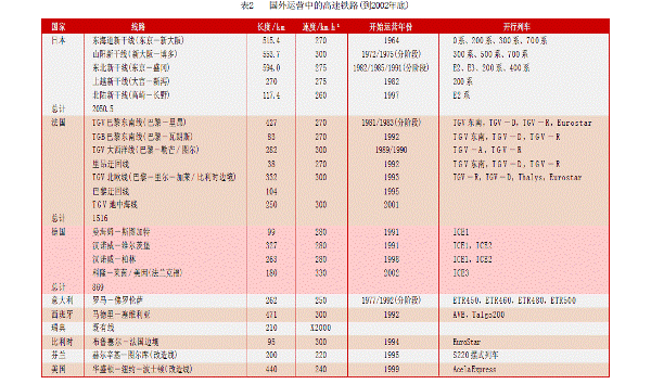 現(xiàn)在,越來越多的國家已經(jīng)擁有了或者正在或者準(zhǔn)備建設(shè)高速鐵路。截至2003 年底,世界上時速超過250km的高速鐵路運營里程已達(dá)到5 900km,還有近3 000km高速鐵路在建。計劃到2015年,世界上擁有高速鐵路的國家和地區(qū)將達(dá)到23個,總里程會達(dá)到30 000km,歐洲地區(qū)將形成高速鐵路網(wǎng)聯(lián)通。表2所列的是到2002年底國外正在運營的高速鐵路概括。
