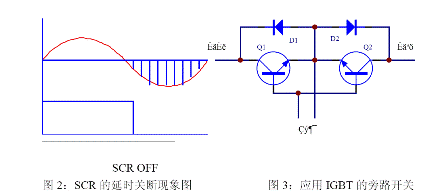 旁路開關(guān)常使用繼電器和可控硅。繼電器在中小功率的UPS 中廣泛應(yīng)用。優(yōu)點是控制簡單,成本低,缺點是繼電器有轉(zhuǎn)換時間,還有就是機電器件的壽命問題??煽毓璩R娪谥写蠊β蔝PS 中。優(yōu)點是控制電流大,沒有切換時間。但缺點就是控制復(fù)雜,且由于可控硅的觸發(fā)工作特性,在觸發(fā)導(dǎo)通后要在反向偏置后才能關(guān)斷,這樣就會產(chǎn)生一個最大10ms 的環(huán)流電流,如圖2。如果采用IGBT,如圖3,則可以避免這個問題,使用IGBT 有控制簡單的優(yōu)點,但成本較高。其工作原理為:當(dāng)輸入為正半周時,電流流經(jīng)Q1、D2,負(fù)半周時電流流經(jīng)D1、Q2。
