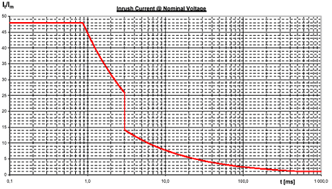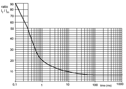 歐洲電信標準協(xié)會(the European Telecommunications Standards Institute)對用于通信系統(tǒng)的開關(guān)電源的沖擊電流大小做了規(guī)定,圖3為通信系統(tǒng)用AC/DC電源供電時的最大沖擊電流限值[4],圖4為通信系統(tǒng)在DC/DC電源供電,標稱輸入電壓和最大輸出負載時的最大沖擊電流限值[5]。圖中It為沖擊電流的瞬態(tài)值,Im為穩(wěn)態(tài)工作電流。