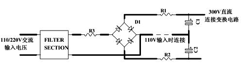 圖5所示為沖擊電流限制電阻的通常位置,對于110V、220V雙電壓輸入電路,應(yīng)該在R1和R2位置放兩個電阻,這樣在110V輸入連接線連接時和220V輸入連接線斷開時的沖擊電流一樣大。對于單輸入電壓電路,應(yīng)該在R3位置放電阻。
