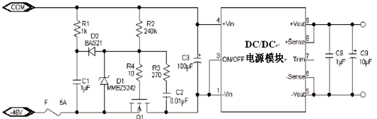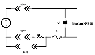 圖7所示電路為長短針法沖擊電流限制電路,在DC/DC電源板插入時,長針接觸,輸入電容C1通過電阻R1充電,當(dāng)電源板完全插入時,電阻R1被斷針短路。C1代表DC/DC電源的所有電容量。