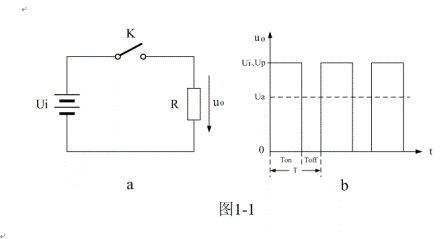 圖1-1-b是串聯(lián)式開關(guān)電源輸出電壓的波形,由圖中看出,控制開關(guān)K輸出電壓uo是一個(gè)脈沖調(diào)制方波,脈沖幅度Up等于輸入電壓Ui,脈沖寬度等于控制開關(guān)K的接通時(shí)間Ton,由此可求得串聯(lián)式開關(guān)電源輸出電壓uo的平均值Ua為: