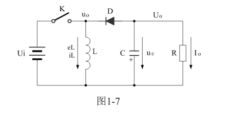 圖1-7中,Ui為輸入電源,K為控制開關(guān),L為儲能電感,D為整流二極管,C為儲能濾波電容,R為負載電阻。當(dāng)控制開關(guān)K接通的時候,輸入電源Ui開始對儲能電感L加電,流過儲能電感L的電流開始增加,同時電流在儲能電感中也要產(chǎn)生磁場;當(dāng)控制開關(guān)K由接通轉(zhuǎn)為關(guān)斷的時候,儲能電感會產(chǎn)生反電動勢,使電流繼續(xù)流動,并通過整流二極管D進行整流,再經(jīng)電容儲能濾波,然后向負載R提供電流輸出??刂崎_關(guān)K不斷地反復(fù)接通和關(guān)斷過程,在負載R上就可以得到一個負極性的電壓輸出。
