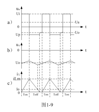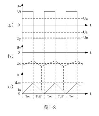 圖1-8、圖1-9、圖1-10分別是控制開關(guān)K的占空比D等于0.5、< 0.5、> 0.5時,圖1-7電路中幾個關(guān)鍵點的電壓和電流波形。圖1-8-a)、圖1-9-a)、圖1-10-a)分別為控制開關(guān)K輸出電壓uo的波形;圖1-8-b)、圖1-9-b)、圖1-10-b)分別為儲能濾波電容兩端電壓uc的波形;圖1-8-c)、圖1-9-c)、圖1-10-c)分別為流過儲能電感L電流iL的波形。應(yīng)該特別注意的是,圖1-8-c)、圖1-9-c)、圖1-10-c)中的電流波形按原理應(yīng)該取負值,但取負值后與前面圖1-5與圖1-6對比反而覺得不好對比和分析,因此,當(dāng)進行具體計算時,一定要注意電流和電壓的方向。[page]