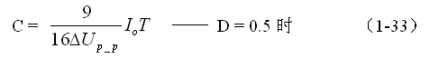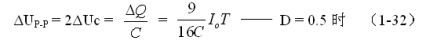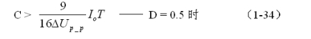 (1-33)和(1-34)式,就是計算反轉(zhuǎn)式串聯(lián)開關(guān)電源儲能濾波電容的公式(D = 0.5時)。式中:Io是流過負載電流的平均值,T為開關(guān)工作周期,ΔUP-P為濾波輸出電壓的波紋,或電壓紋波。一般波紋電壓都是取電壓增量的峰-峰值,因此,當(dāng)D = 0.5時,波紋電壓等于電容器充電的電壓增量,即:ΔUP-P = 2ΔUc 。