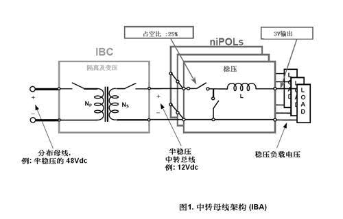 IBA的理念是把母線電壓降至一個稍稍高于負載點的電壓,再由較便宜的降壓器(niPoL)來完成余下的工作。降壓器(niPoL)經(jīng)由電感器傳輸電壓到負載,這電壓相等于上開關(guān)和下開關(guān)共同端電壓的平均值,等如上開關(guān)電壓占空比與中轉(zhuǎn)母線的乘積。