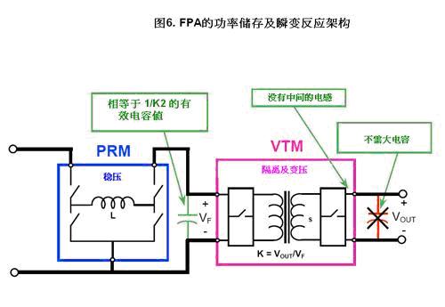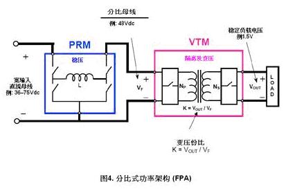 跟分布式架構(gòu)或中轉(zhuǎn)母線架構(gòu)不一樣,在分比式架構(gòu),穩(wěn)壓功能由PRM提供,可遠離負載。VTM作為負載點的轉(zhuǎn)換器,它不需要提供穩(wěn)壓的功能,?可以無須靠近負載。它只負責按K比值“倍大電流”或“降低電壓”(VOUT=VfK),VTM可在整個轉(zhuǎn)換周期傳送電流,它的占空比是百份之一百。FPA以分比母線傳輸功率,可以較隨意的選擇電壓,無須如前所述的IBA架構(gòu),因固有的沖突,中轉(zhuǎn)電壓只能選定在稍高于負載的電壓,否則它的占空比將無法管理。