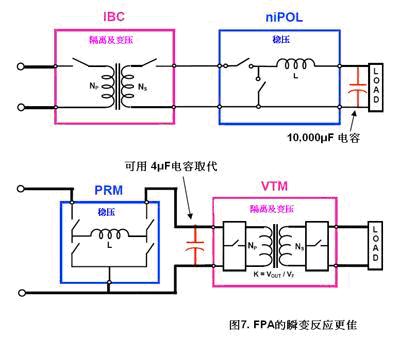 FPA的瞬變反應較IBA理想。如前述,IBA把電感器放在中轉(zhuǎn)母線與負載之間,產(chǎn)生電流慣性。在FPA分比母線與負載之間沒有電感器(圖6),由于VTM不受電感慣性左右,可快速的反應負載變化。在分比母線的電容由于沒有電感的阻隔,可對負載有效旁路,該電容相等于在負載加上1/K2倍電容值,這便無須在負載點加上大電容。圖7清楚表示在FPA只需用上4uF的電容便可以取代IBA中的10000uF電容。
