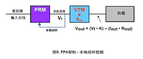 本地閉環(huán)(圖8)是最簡單的方法。PRM感應它自己的輸出電壓,再調(diào)整及維持分比母線電壓在一個常數(shù)。負載電壓按VTM的輸出阻抗的比例升降(VfK-IoutRout)。一個PRM可同時連接多個VTM。