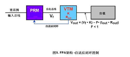 自適應閉環(huán)(圖9)。由VTM把訊號傳送給PRM,讓PRM調(diào)整分比母線。以補償VTM的輸出阻抗。自適應閉環(huán)只需要在VTM與PRM之間接上簡單、非隔離的反饋電路,它的穩(wěn)壓精度便可達+/-1%。