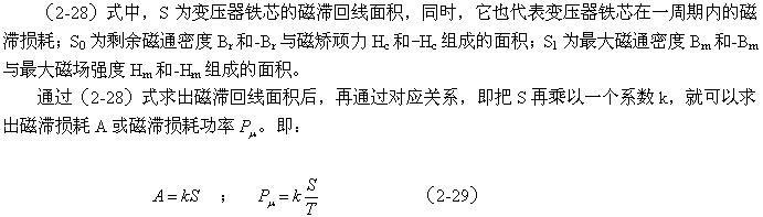 由(2-21)、(2-22)、(2-23)、(2-24)、(2-25)、(2-26)式可知,如要計(jì)算變壓器鐵芯的磁滯損耗,只需要計(jì)算變壓器鐵芯磁滯回線面積的大小,然后通過(guò)它們的對(duì)應(yīng)關(guān)系,就可以求出變壓器鐵芯的磁滯損耗。