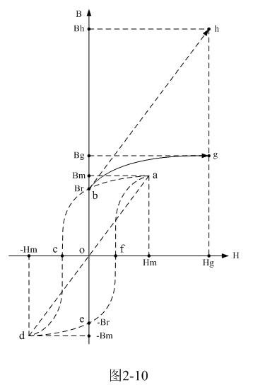 但當(dāng)變壓器鐵芯中的磁化過程是從上次剩余磁通密度Br的位置開始時,上面所分析的理想磁化過程將要被破壞,磁通密度B不會再沿著理想磁化曲線d-a進(jìn)行,而是沿著另一條新的等效磁化曲線進(jìn)行;這條新的等效磁化曲線應(yīng)該與原理想磁化曲線d-a平行,并且經(jīng)過Br點(diǎn),圖2-10中虛線b-h就是這條新的等效磁化曲線的一部分。這里只畫出新等效磁化曲線的一半,另一半在圖2-10中沒有畫出。