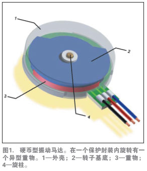 多數(shù)振動(dòng)馬達(dá)由一個(gè)較小的電動(dòng)馬達(dá)驅(qū)動(dòng)一個(gè)偏心配重,如圖1所示。馬達(dá)為直流有刷或無刷電機(jī),有兩種基本的結(jié)構(gòu):硬幣狀(扁平)與圓柱形(條狀)。