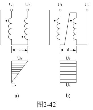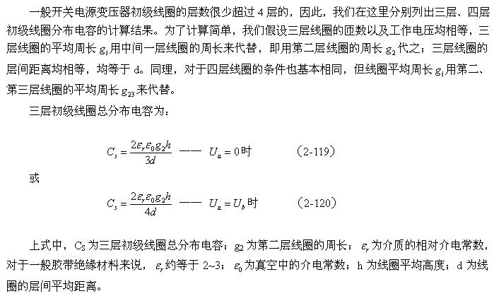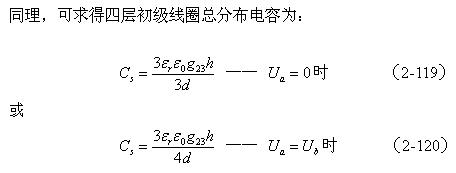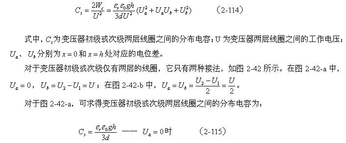 對(duì)于圖2-42-b,可求得變壓器初級(jí)或次級(jí)兩層線圈之間的分布電容為: