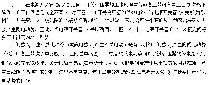 (2-140)式對于計算漏感 產生的反電動勢或其它電感產生的反電動勢同樣有效。漏感 中存儲的能量可根據(2-138)式求得;而流過漏感 的電流,對于反激式開關電源:可認為與勵磁電流的大小基本相等,因為,在反激式開關電源中,等效負載電阻等于無限大;對于正激式開關電源:可認為與流過等效負載電阻的電流大小基本相等,因為,在正激式開關電源中,勵磁電流相對于流過等效負載電阻的電流,很小。