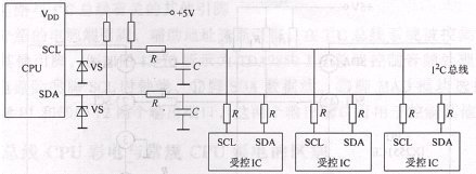 直接式I2C總線是指被控集成電路直接或通過電阻掛在I2C總線上,其電路工作原理圖如圖4所示。因?yàn)镃PU的I2C總線輸出端口內(nèi)部電路形式為集電極開路(或漏極開路)形式,所以在CPU的I2C總線輸出端必須通過上拉電阻R接+5V電源,為CPU的I2C總線輸出端口的內(nèi)部電路供電。圖4中的電阻R為隔離電阻,C為抗干擾電容,主要是為了提高I2C總線上數(shù)據(jù)傳輸?shù)目煽啃裕乐拐`動作進(jìn)人維修狀態(tài)和防止由于外部干擾信號改變I2C總線數(shù)據(jù)。穩(wěn)壓管VS是為了防止外部高電壓損壞CPU的I2C總線輸出端的內(nèi)部電路。