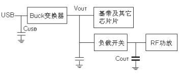 對于這種架構(gòu),有時(shí)負(fù)載開關(guān)會連接到降壓變換器輸出(圖2),然后射頻模塊連接到負(fù)載開關(guān),這樣降壓變換器就只能用較小的輸入電容。這將導(dǎo)致輸入電壓紋波大,尤其是其輸出瞬態(tài)過載時(shí),輸入電壓的最低點(diǎn)可能低于其最小工作電壓Vcc(Min),系統(tǒng)將關(guān)斷而復(fù)位重新起動(dòng),因此也不建議采用這種方式。