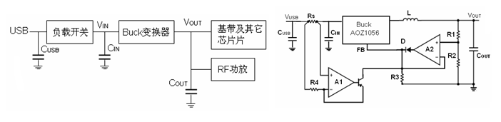 如果直接用降壓變換器全額輸出為射頻模塊供電,則要設(shè)計(jì)一個(gè)輸出電流為2A的降壓變換器(圖1a)。
