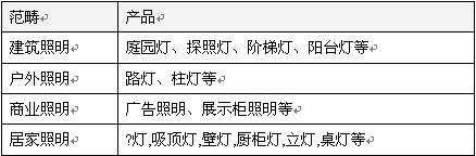 隨著技術(shù)的改善,LED燈具的用途已由過去數(shù)十年單純應用在指示燈、信號燈等,逐步使用在手機背光源、車內(nèi)用照明、煞車燈、LCD電視、手提電腦背光源等輔助照明;而在近兩年內(nèi),其開始成為主照明系統(tǒng),所應用的范疇可涵蓋建筑、戶外、商業(yè)、及居家等,產(chǎn)品則分別有: